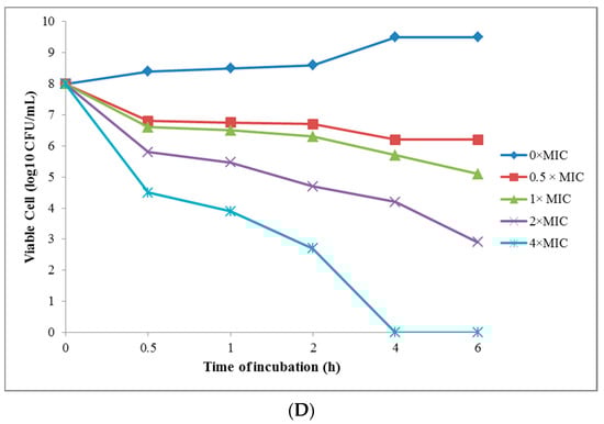 (A) The time-kill curve plots for Escherichia coli (B) Shigella flexneri (C) Bacillus cereus, and (D) Staphylococcus aureus, following the exposure to the greenly synthesized AgNPs at 0 × MIC, 0.5 × MIC, 1 × MIC, 2 × MIC, and 4 × MIC.