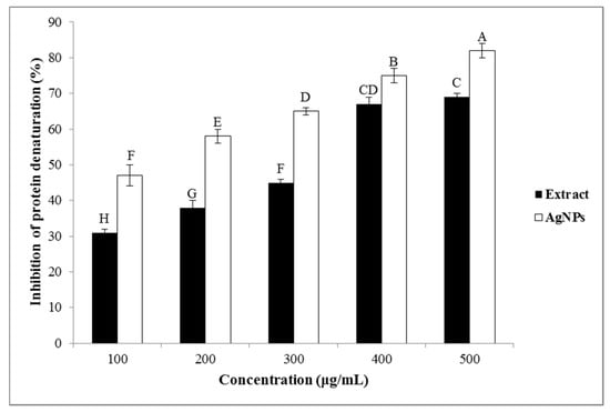 The protein denaturation is a perfectly documented reason for the inflammation in conditions as rheumatoid arthritis [48]. The prevention of the protein denaturation is the main mechanisms of action of non-steroidal anti-inflammatory drugs (NSAIDs) [49]. Therefore, the ability of the studied extract and the greenly synthesized AgNPs to prevent the denaturation of proteins could be responsible for their anti-inflammatory properties. As can be seen in Figure 7, both the A. tribuloides root extract and the greenly synthesized AgNPs produce a considerable anti-inflammatory activity in a dose-dependent manner. Its value for the highest concentration (500 μg/mL) of the A. tribuloides root extract was 69%, while this amount for the synthesized AgNPs was 82%. It was observed that the greenly synthesized AgNPs had the higher anti-inflammatory effects as compared to those for the A. tribuloides root extract. The results of the current study indicated that the obtained AgNPs were capped by the secondary metabolites of the A. tribuloides root extract. It was previously suggested that the secondary metabolites of the plant extracts can inhibit the lysosomal components release of the neutrophils at the inflammation location [50]. The lysosomal compounds are the proteinases and bactericidal enzymes that cause the further inflammation and the tissue damage after the extracellular release [51].