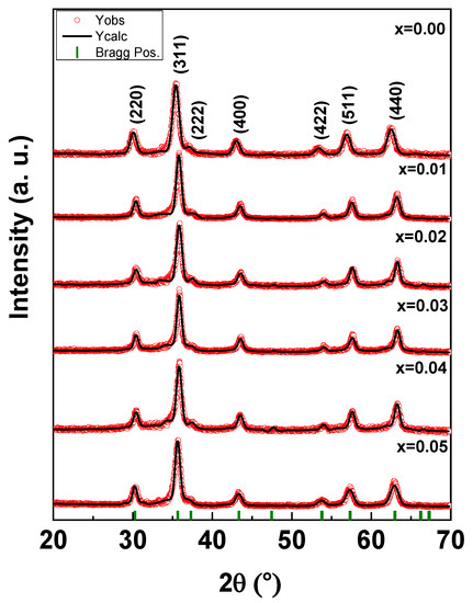 Figure 1 depicts the XRD powder pattern of (Co0.5Ni0.5)[TmxTbxFe2−2x]O4 (x = 0.00–0.05) NSFs. The characteristic peaks of the NSFs adequately matched with the JCPDS Card No 22-1086, and thus indicated the successful crystallization of the single phase of Co-Ni spinel ferrites. In addition, the Rietveld refinement revealed the absence of any trace rare earth oxides, suggesting the purity of the synthesized NSFs. It can be observed that, that the most intense peak at 2θ = 34.96° (x = 0.01–0.05) with a crystal plane (311) is shifted to a higher diffraction angle while x is increasing. Moreover, this peak becomes slightly broaden when increasing the ratio of the substituted ion; this is a characteristic of crystals with small particle size. Hence, the introduction of more Tm and Tb into the solid solution of the spinel ferrites hinders the crystal growth. A similar observation has been reported, where substitution using Gm3+, Sm3+ and Eu3+ resulted in a crystallite size reduction of Ni-Co ferrite [48]. On the other hand, cell parameters, cell volume, crystallite sizes, goodness fit (χ2), and R-factors have been evaluated via refinement through Match3 and a Full Proof program of X-ray experimental data as included in Table 1—lattice parameter (a), volume of unit cell (V), and average crystal size determined from XRD patterns (DXRD). A decrease in cell parameters and cell volume was observed when increasing the content of Tm3+ and Tb3+ (x = 0.0–0.05), this could be due to the deformation in spinel crystal by larger rTm3+ (0.88 Å) and rTb3+ (0.92 Å) in comparison with rFe3+(0.64 Å) which caused depositary in the grain boundary and hinders the cell parameters growth [49]. The crystal sizes were computed with the Debye–Scherer formula by considering the maximum peak (311) and found in the range of 11–13 nm.