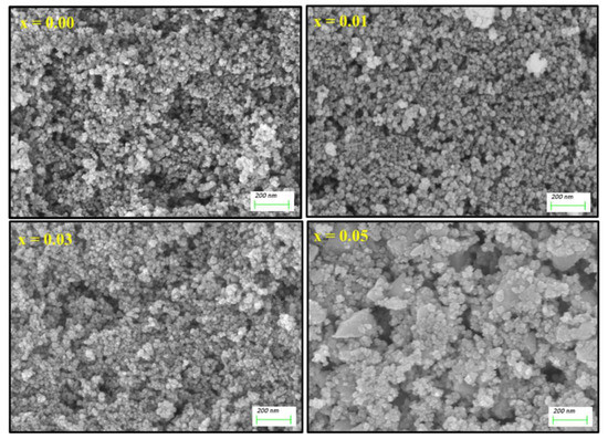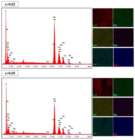The morphological examination was conducted using SEM and the images for (Co0.5Ni0.5)[TmxTbxFe2−2x]O4 (x = 0.00, 0.01, 0.03 and 0.05) NSFs were depicted in Figure 2. The crystals exhibited spherical shape morphology with an agglomerated appearance obviously due to ferrimagnetic character. Overall, the sample displayed an appreciable distribution of particle size, in the range 15 nm that agreed with the XRD analysis. Of note, the sample with the highest Tb3+ and Tm3+ doping (x = 0.5) contains some irregularly shaped nanocrystals, these crystals agglomerates and produce a secondary grain with a size range of 200–500 nm. The elemental weight percentage of (Co0.5Ni0.5)[TmxTbxFe2−2x]O4 (x = 0.02 and 0.05) NSFs were evaluated using EDX elemental and mapping as shown in Figure 3. The EDX spectrum of all samples have verified the occurrence of Co, Ni, Tm, Tb, O and Fe elements in products. This also indicated the efficiency of the ultrasound synthesis method.