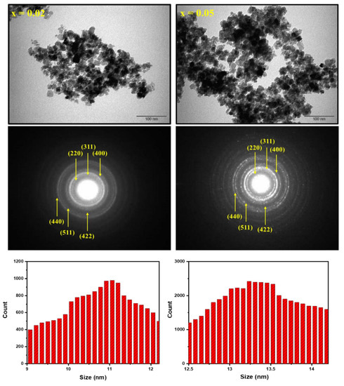 To further study the structure, morphology, and particle size, TEM and SAED were employed on Co0.5Ni0.5)[TmxTbxFe2−2x]O4 (x = 0.02 and 0.05) NSFs as seen in Figure 4. The TEM images disclosed the aggregation of cubic and spherical particles. Thus, observation of TEM images confirmed the uniformity of the particles. The particle size distribution histogram were calculated via Image J software and found that DXRD of products have been within the range of 9–15 nm (Figure 4). The SAED showed a spotty bright ring with different intensities that confirmed the purity of the spinel NSFs ferrites structure. Accordingly, the index planes are consented with the XRD results.