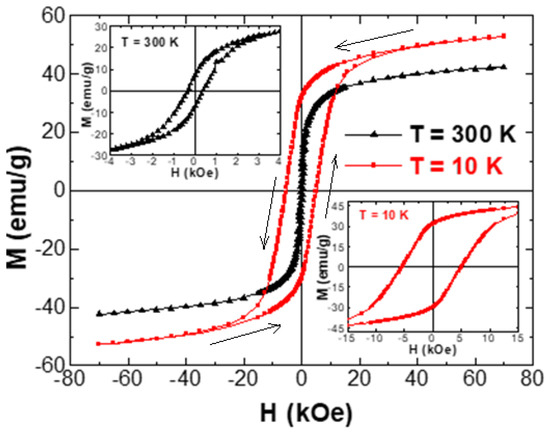 Magnetization versus applied magnetic field performed at T = 300 and 10 K for Co0.5Ni0.5Fe2O4 NSFs. The insets show magnified views of the region near the origin (H = 0 kOe).