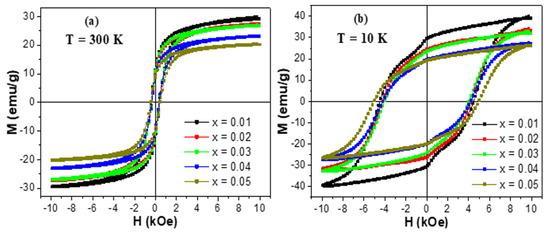 M-H hysteresis loops of (Co0.5Ni0.5)[TmxTbxFe2−x]O4 NSFs with x = 0.01–0.05 performed at: (a) T = 300 K and (b) T = 10 K.