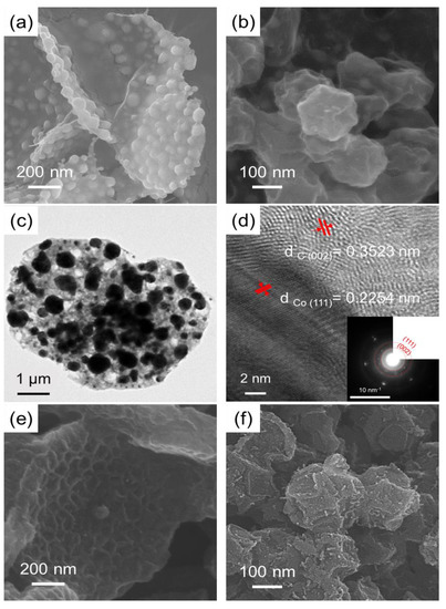 SEM images of (a) CM/L/M; (b) CCo-MOF; FEG-TEM image of (c) CM/L/M and (d) the magnified FEG-TEM image with SAED in the inset; (e) WNPC and (f) nanoporous carbon (NPC).