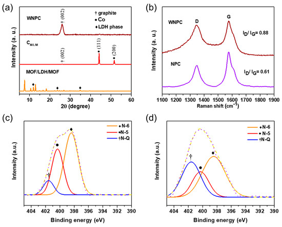 (a) XRD pattern of MOF/LDH/MOF, CM/L/M, and WNPC; (b) Raman spectrum of WNPC and NPC. High-resolution XPS spectra for N1s of (c) WNPC and (d) NPC.