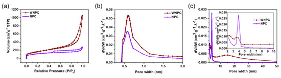 The specific surface areas and pore size distribution of WNPC and NPC were investigated by N2 adsorption–desorption isotherms (Brunauer–Emmett–Teller (BET) theory calculation). In Figure 4a, WNPC and NPC both presented H3 and H4 hysteresis loops, respectively [37]. According to the micropore distribution analysis (Figure 4b), the size distributions below 2 nm of NPC and WNPC are similar due to their intrinsic micropore nature. It is notable that WNPC exhibited a broader mesopore distribution of 2–50 nm (Figure 4c), which differed from the typical mesopore distribution of MOF [19], a factor attributed to the well-dispersed MOFs in the in-situ growth preventing the aggregation of Co-MOFs during carbonization. Therefore, WNPC also displayed a larger specific surface area (594 m2g−1) than NPC (394 m2g−1).