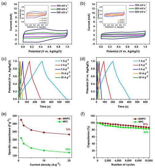 Cyclic voltammograms (CV) curves of (a) WNPC and (b) NPC with different scan rates; galvanostatic charge–discharge (GCD) curves of (c) WNPC and (d) NPC at different current densities; (e) Variation of specific capacitance against the current density of WNPC and NPC; (f) Cycling performance of WNPC and NPC electrode at a current density of 4 A·g−1.