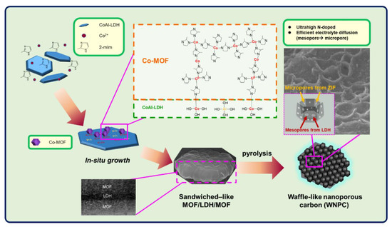 Schematic view of the synthesis of the sandwiched MOF/LDH/MOF via in-situ growth and the waffle-like nanoporous carbon (WNPC).