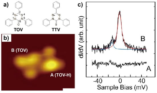 (a) Chemical structures of 1,3,5-triphenyl-6-oxoverdazyl (TOV) and 1,3,5-triphenyl-6-thioxoverdazyl (TTV). (b) Scanning tunneling microscopy (STM) image of the TOV molecules of types A and B on Au(111). (c) Differential conductance (dI/dV) spectra recorded at TOV molecules of types A and B. Adapted from [44] with permission from The American Chemical Society, 2013.
