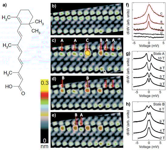 (a) Chemical structure of retinoic acid (ReA). (b) STM image of the striped pattern formed by ReA molecules in their pristine form as deposited on Au(111). (c–e) STM images of the same area after manipulating the marked molecules at a sample voltage V = −2.5 V. (f) dI/dV spectra recorded at pristine (bottom curve) and four manipulated states of ReA. Magnetic field evolutions of states (g) A and (h) B. Adapted from [54], with permission from American Physical Society, 2016.
