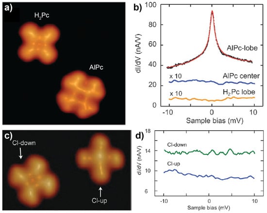 Hong et al. [57] employed the recently developed vacuum synthesis method for the preparation of AlPc, a main-group-metal phthalocyanine molecule, via the metalation of pristine H2Pc on Au(111). The formation of the new species was confirmed by its distinct appearance in STM images (Figure 3a) and the different electronic structures as detected by dI/dV measurements compared with H2Pc. The existence of a spin in AlPc was evidenced by the detection of a zero-bias peak in the dI/dV spectrum acquired at the lobe of AlPc (top-most curve in Figure 3b) which was assigned to Kondo resonance according to its splitting in the increasing magnetic field. The theoretical results provided insights into the origin of the spin by showing a doublet ground state of AlPc where the singly occupied molecular orbital (SOMO) and singly unoccupied molecular orbital (SUMO) were both in a π* state. Therefore, it is concluded that the spin density of the molecule was originated from the unpaired π-electron, which was mainly delocalized over the lobes of the Pc ring. This explained the absence of Kondo resonance at the center of AlPc (middle curve in Figure 3b). Further comparative investigation of chlorinated AlPc (ClAlPc), an AlPc derivative formed by the axial bonding of the Al atom with a Cl atom, on Au(111) (Figure 3c) showed no Kondo signature for the absorbed ClAlPc molecules (Figure 3d), since all molecular orbitals of ClAlPc became doubly occupied upon chlorination. As a consequence, the spin state of AlPc on Au(111) could be tuned by the attachment/detachment of a Cl atom to the Al center.