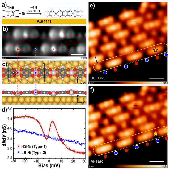 (a) Schematic illustration of the coordination reaction between tetrahydroxybenzene (THB) and Ni on Au(111). (b) STM image of the coordination chains. (c) Optimized models of the coordination chain. (d) dI/dV spectra acquired at a HS-Ni and a LS-Ni, respectively. STM images of the coordination chains (e) before and (f) after the tip-induced collective switching within the marked chain. Adapted from [78], with permission from American Chemical Society, 2020.