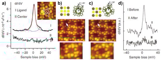 Komeda and coworkers reported the switch-on and off of a π-electron spin of TbPc2 on Au(111) by rotating the upper Pc ligand with controlled current pulses [83]. There are two spin systems in TbPc2, that is, the Tb ion and an unpaired electron in the ligand π orbital. Although the magnetic signature of the former was invisible by STM in this case, the Kondo effect of the latter was captured by spectroscopic investigations. The dI/dV measurement revealed the site dependence of the Kondo feature: the Kondo peak was prominent around the lobes of the molecule but was dramatically attenuated at the center (Figure 8a). This served as an evidence showing that it was the spin residing on the Pc ligand that was responsible for the Kondo resonance. Then, it was found that the Kondo feature could be switched on and off when the upper Pc ligand was rotated by applying a tip pulse to the molecule. For a TbPc2 molecule with an azimuthal rotational angle (θ) between the two Pc ligands of 45° whose center appeared brighter in the STM images (Figure 8b), the Kondo peak could be detected (top curve in Figure 8d). Once pulsed, the center of the molecule became darker, which indicated a change in θ of the molecule to 30° (Figure 8c). Meanwhile, the dI/dV measurement showed the disappearance of the Kondo resonance for the pulsed molecules (bottom curve in Figure 8d). This θ-dependent switching of the Kondo effect was interpreted as a result of the variation in the molecular spin state. For the TbPc2 molecules with θ = 45°, the Pc ligand of the molecule absorbed on Au(111) had an S = 1/2 spin originated from the unpaired π-electron. However, the rotation of the upper ligand to θ = 30° led to the rearrangement of the frontier molecular orbitals, which resulted in the charge transfer from the surface, therefore quenching the molecular spin and hence the Kondo state.