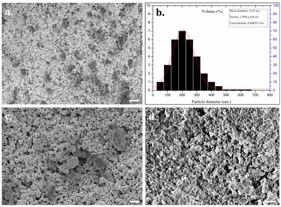 Surface morphology of human teeth-derived bioceramics through heat treatment; (a) the FE-SEM image of fresh sample; (b) particle size distribution curve of fresh bioceramics (n = 3, 50 particles); (c) the FE-SEM image of SBF-soaked bioceramics (6 months); and (d) the FE-SEM image of SBF-soaked bioceramics (12 months) (Scale bar = 10 μm).