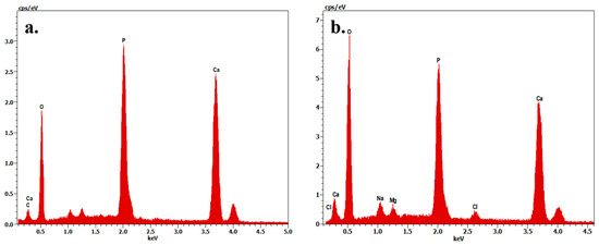 The energy-dispersive X-ray (EDX) profile of the prepared bioceramics; (a) fresh; and (b) SBF-soaked bioceramics (12 months).