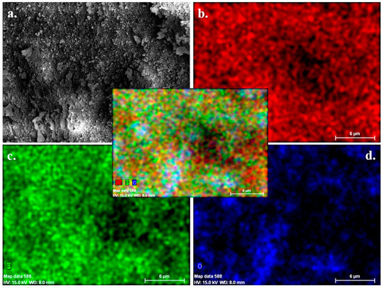 (a) The EDX elemental mapping of human teeth-derived bioceramics; (b) calcium; (c) phosphorous; and (d) oxygen (a merged image is shown at the center).