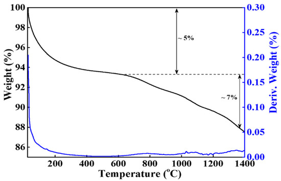 The XRD pattern of human teeth-derived bioceramics is shown in Figure 4. The XRD pattern resembled the previously reported pattern of HAp, indicating that heat treatment facilitates the formation of natural HAp from human teeth [27]. The XRD peak at 2θ = 33.3° suggested the existence of the CaP moiety in developed bioceramics [28]. The presence of the different functional groups in bioceramics was examined through the FTIR spectroscopy. The FTIR spectra of fresh and SBF-soaked (12 months) bioceramics are shown in Figure 5. The FTIR results are identical to the HAp pattern [27]. The appearance of several peaks in the regions of 3532, 2530–2329, 1640–1620, and 960–570 cm−1 matched the corresponding absorption peaks of HAp. The appearance of these peaks indicated the presence of different ions such as phosphate (PO43−), hydroxyl (OH−), and carbonate (CO32−) in bioceramics. The thermal stability of the developed bioceramics was determined through TGA, and the obtained thermogram is given in Figure 6. The TGA curve shows the ~5% weight loss in the lower temperature region (up to 200 °C). A small endothermic transition was observed in this region in the DTA curve, but no noticeable weight loss was noted in the range of ~400 °C to 600 °C. However, a continuous weight loss was observed above 600 °C. The total weight loss of the bioceramics was ~12% at 1400 °C.