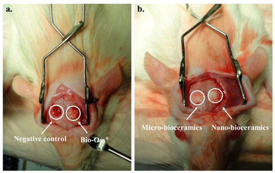 Images of in vivo transplantation; (a) with negative and positive control; and (b) in the presence of different sizes of bioceramics.