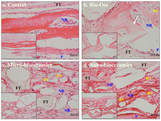 Hematoxylin and Eosin (H&E)-stained images of human-teeth derived bioceramics; (a) negative control; (b) positive control; (c) with micro and nano-sized bioceramics; and (d) in the presence of nano-sized bioceramics after four weeks of transplantation (Scale bar: 50 and 100 μm) Here, NB, P, BV, and FT indicate the new bone, periosteum, blood vessel, and fibrous tissue, respectively.