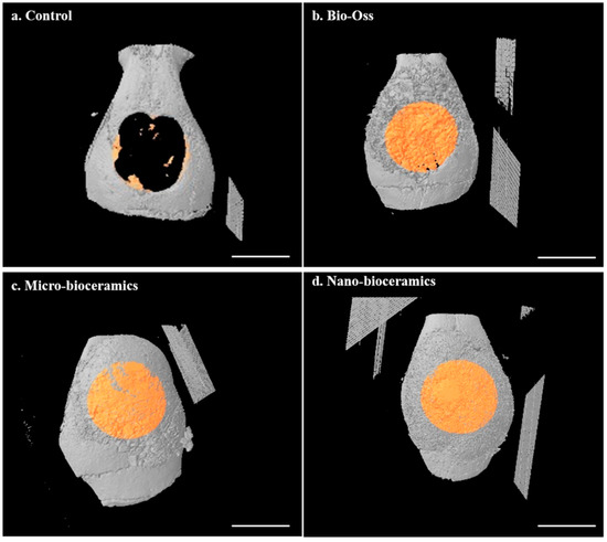 Micro-computed tomography (µCT) images of the defected mice skull in the presence of indicated materials after four weeks of transplantation; (a) control, (b) Bio-Oss, (c) micro-bioceramics, and (d) nano-bioceramics (Scale bar: 2 mm). The percentage bone healing was ~7 ± 2.08, 92 ± 3.27, 88 ± 4.70, and 95 ± 2.14% for the control, Bio-Oss, micro, and nano-bioceramics, respectively.