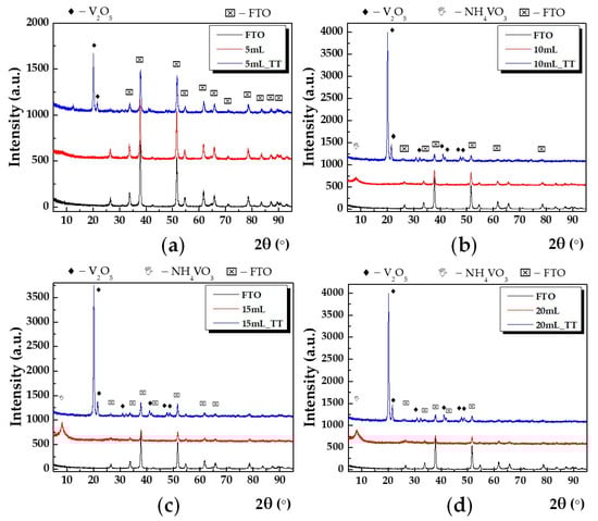 Grazing incidence X-ray diffraction at small incidence angle (e.g., 0.5°) was used to reveal the crystalline structure of thin films. In Figure 1 are shown GIXRD patterns for the investigated samples: 5, (a), 10, (b), 15, (c) and 20 mL (d) before and after of the thermal treatment (TT). In addition, the GIXRD pattern for FTO substrate (black line) was added.
