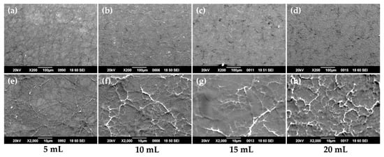 SEM images of the as-deposited films, before annealing (a–d) SEM micrographs of the 5, 10, 15, and 20 mL precursor quantities deposited films at 200× magnification (scale size 100 ¼m); (e–h) SEM micrographs of the 5, 10, 15, and 20 mL precursor quantities deposited films at 2000× magnification (scale size 10 ¼m).