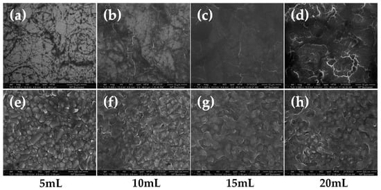 SEM characterization of the as-deposited films revealed the films surface evolution as shown in Figure 3. Figure 3a–d presents low magnification SEM micrographs of the 5, 10, 15, and 20 mL precursor quantities deposited films. One can see that films are uniform and homogeneous, free of cracks. A closer view to their surfaces, shown in Figure 3e–h, reveals the presence of random grains-walls structures uniformly distributed onto the surface. Increased precursor quantity (that can be associated to films thickness) seems to determine the increase in wall-like structures density.