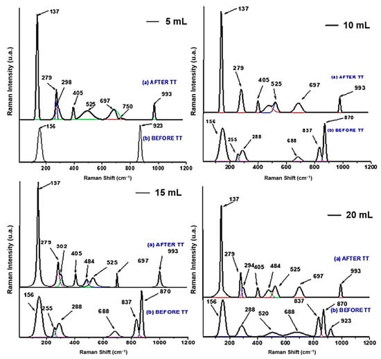 To evaluate the errors given by each reflection, the peak broadening was considered as the convolution of two parts, i.e., physical broadening and instrumental broadening [20,21]. Hence, in our case, the errors can be arisen from the instrumental broadening, which was established from a measurement of a monocrystalline Si wafer. The standard deviation of the experimental points was calculated and added on the graph. It can be observed that the experimental points present low deviations. However, the obtained e intercept value showed that the mean crystallite size has the following values: 21.3 nm (5 mL), 20.1 nm (10 and 15 mL), and 19.8 nm (20 mL). The positive slope of the linear fit indicates an expansion of the lattice. In essence, this fact is showed above (see Table 1), where a greater volume of the unit cell is obtained (up to 2.09% in the case of 5 mL_TT sample) compared to the theoretical unit cell volume for α-V2O5. In addition, this sample presents the highest value for the lattice strain according to W-H analysis. The results obtained from XRD indicate that the thermal treatment led to V2O5 crystalline thin films with the crystallite size around of 20 nm, accompanied by a small lattice strain.