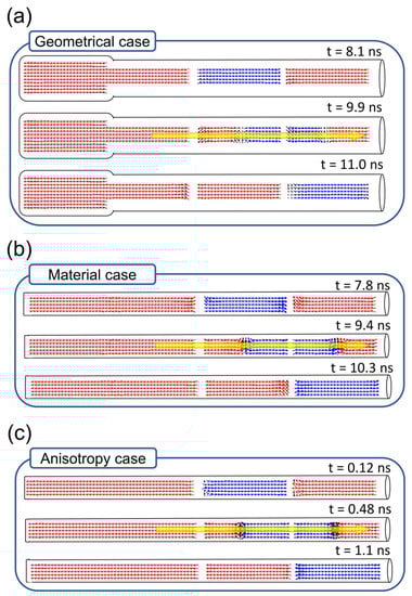 Figure 3. On the other hand, the bit movement of each nanowire should be performed individually, so it is necessary to investigate the possible influence of the neighboring nanowires when a spin current is applied to the central one. For that, the spins of the external nanowires were fixed during the simulation of the bit-movement in the central nanowire. 3D representations of the three different configurations compared in this section are plotted in