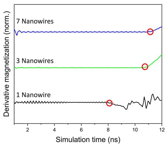 Mx) for each case. It can be clearly seen how the onset of the bit movement increases from 8.1 to 10.8 ns in the case of 1 and 3 nanowires, respectively, and reaches 11.2 ns in an array of 7 nanowires. These results show a significant delay of almost 3 ns in the depinning of the DW when the central nanowire has others surrounding it, which is a critical difference that should be considered in the experimental development of a future 3D racetrack memory device. However, it can be observed that the number of nanowires around it only slightly modifies this onset (10.8 vs. 11.2 ns), so the density of nanowires in the array does not seem to be a key factor in the development of the 3D racetrack memory. As in the previous case where it was analyzed a single nanowire, the magnetic configuration of the surrounding nanowires does not introduce any modification in the depinning process.