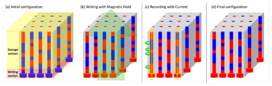 Figure 7a,b). To record the new information into the memory device, a spin-polarized current is applied to selected tracks (yellow arrows in