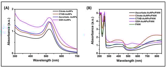 The PANI and AuNP/PANI composites were examined with UV-Vis spectroscopy for electronic transitions. In the cases of citrate-, GSH-, and ascorbate-capped AuNPs, strong localized plasmon resonance (LSPR) absorption peaks were observed at 521 nm. The analogous peak was observed at 526 nm for CTAB-capped AuNPs (Figure 1A). These peaks can be ascribed to LSPR of AuNPs. The collective oscillations of electrons are mainly postulated for the LSPR, due to which AuNPs display a strong absorbance band in the visible region ranging between 500 and 600 nm. Note that the shape and size of the AuNPs are critical parameters which give rise to the LSPR absorbance maximum [15,16,17,19].