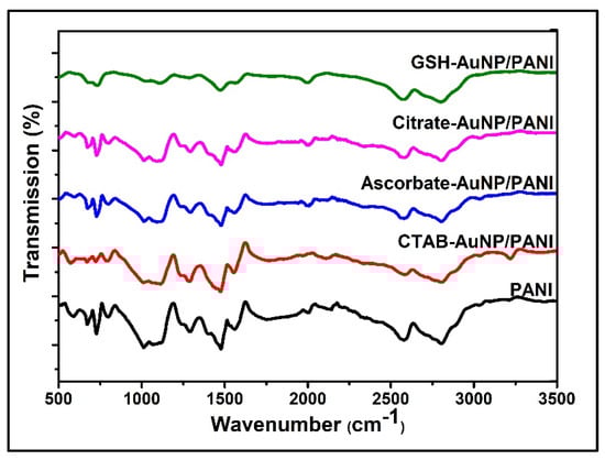 The synthesized PANI and its composite structures with citrate, ascorbate, and CTAB-functionalized AuNP exhibited dark green color, whereas that for GSH-AuNP/PANI composite was brown (Figure S2). It is worth mentioning that the green color of PANI and AuNP/PANI composites was mainly due to the presence of emeraldine salt form of PANI, while the brown color in GSH-AuNP/PANI should reflect the presence of pernigraniline form of PANI [18]. In order to validate the control over synthesized PANI and AuNP/PANI composite, in terms of physical/chemical characteristics, the synthesis (followed by characterization) of these materials was performed several times. Interestingly, similar results were obtained each time to indicate a good hold over the controlled synthesis of PANI and its composites.