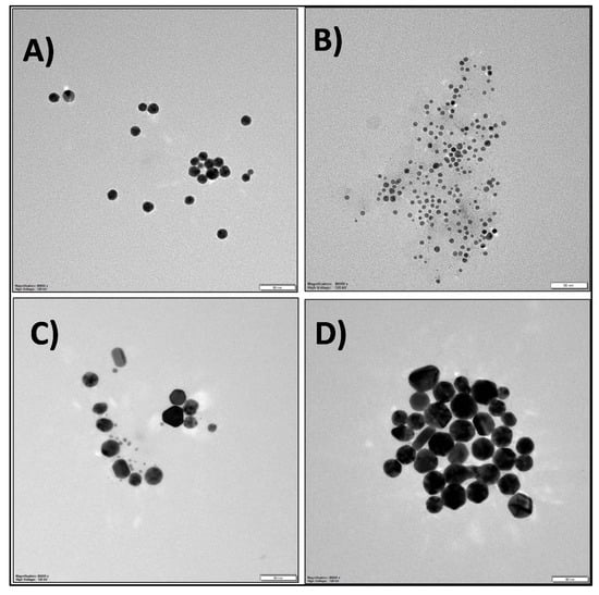 TEM images of AuNPs capped with different functional groups: (A) citrate, (B) ascorbate, (C) GSH, and (D) CTAB-functionalized AuNPs at 50 nm scale bar.
