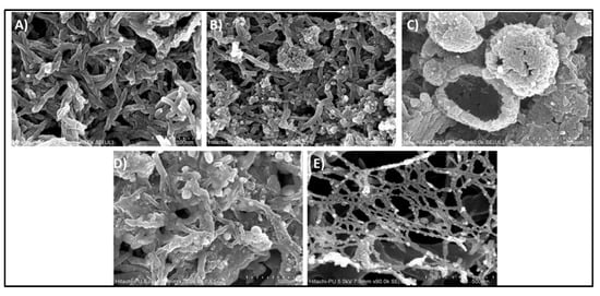 FE-SEM images (at 500 nm scale bar) of PANI and PANI/AuNPs composite samples prepared by interfacial polymerization with different types of functionalized AuNPs: (A) PANI, (B) citrate-AuNP/PANI, (C) ascorbate-AuNP/PANI, (D) GSH-AuNP/PANI, and (E) CTAB-AuNP/PANI.