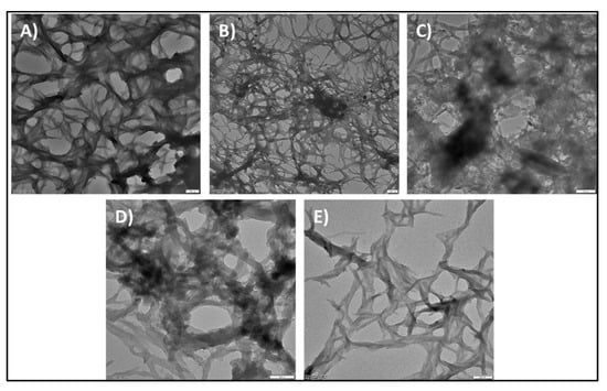 TEM images (at 200 nm scale) of PANI and PANI/AuNPs composite samples prepared by interfacial polymerization with different types of functionalized AuNPs: (A) PANI, (B) citrate-AuNP/PANI, (C) ascorbate-AuNP/PANI, (D) GSH-AuNP/PANI, and (E) CTAB-AuNP/PANI.