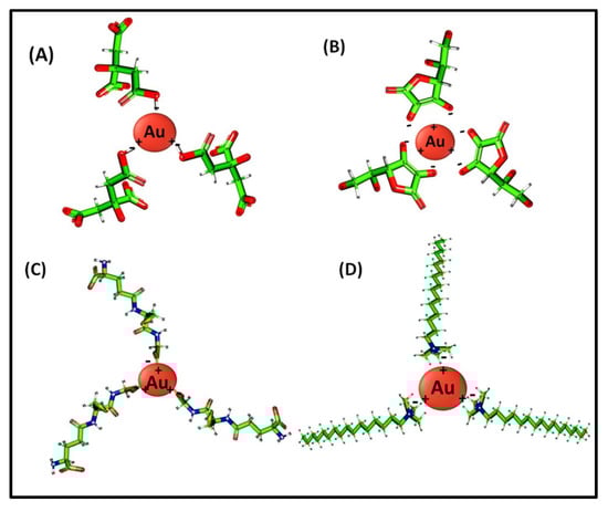 Modeled chemical structures of the capping agents used to functionalize AuNPs: (A) Citrate, (B) Ascorbate, (C) GSH, and (D) CTAB.