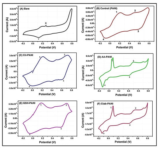 The electrochemical properties as studied using cyclic voltammetry on Au SPE: (A) bare electrode, (B) control (PANI), (C) citrate-AuNP/PANI, (D) ascorbate-AuNP/PANI, (E) GSH-AuNP/PANI, and (F) CTAB-AuNP/PANI. All the spectra were recorded with 0.5 M H2SO4 as electrolyte. X and Y represent the characteristic signals for the electrolyte. Peak labels 1, 2, 3, and 4 are transition peaks for emeraldine to pernigraniline (emer-perni), pernigraniline to emeraldine (perni-emer), emeraldine to leucoemeraldine (emer-leuco), and leucoemeraldine to emeraldine (leuco-emer) forms of PANI, respectively.