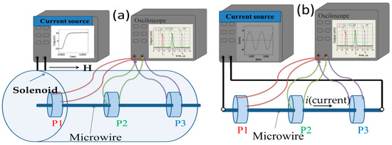 - Zhukova, V.; Blanco, J.M.; Chizhik, A.; Ipatov, M.; Zhukov, A. AC-current-induced magnetization switching in amorphous microwires. Front. Phys. 2018, 13, 137501. [Google Scholar] [CrossRef]