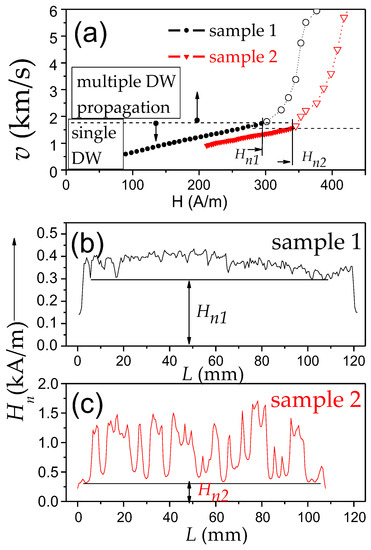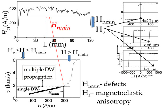 - Zhukov, A. Domain Wall propagation in a Fe-rich glass-coated amorphous microwire. Appl. Phys. Lett. 2001, 78, 3106–3108. [Google Scholar] [CrossRef]