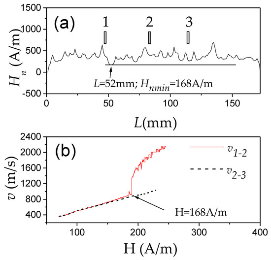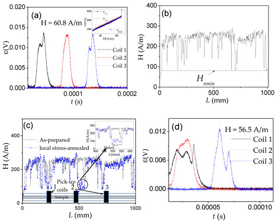 - The Hn(L) dependencies, measured by moving the same microwire forward and backward through the magnetizing coil, have the same oscillations sequence and amplitude (see Figure 3a). Accordingly, Hn(L) distributions are completely reproducible for a given sample (see Figure 3a). In some sense, Hn(L) distribution is the signature of each sample. A slight shift in the Hn(L) dependencies must be attributed to the precision of the forward and backward microwire movement.