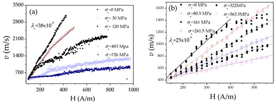 An example of such correlation is shown in Figure 4, where v(H) depends on two bistable amorphous glass-coated microwires Fe74Si11B13C2 and Fe75B9Si12C4, (ρ-ratios 0.85 and 0.76, respectively) marked as sample 1 and 2, respectively, are presented. In both samples, linear v(H) dependencies are observed up to H = 294 and 340 A/m for samples 1 and 2, respectively (maximum DW velocity v of 1.7 km/s). However, for the region of higher H, deviations from the linear v(H) dependencies are clearly seen (Figure 4a).