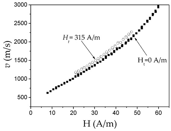 - Zhukova, V.; Blanco, J.M.; Ipatov, M.; Zhukov, A. Effect of transverse magnetic field on domain wall propagation in magnetically bistable glass-coated amorphous microwires. J. Appl. Phys. 2009, 106, 113914. [Google Scholar] [CrossRef]