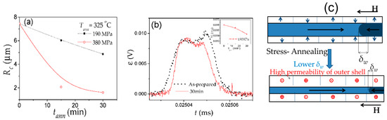- Zhukov, A.; Chichay, K.; Talaat, A.; Rodionova, V.; Blanco, J.M.; Ipatov, M.; Zhukova, V. Manipulation of magnetic properties of glass-coated microwires by annealing. J. Magn. Magn. Mater. 2015, 383, 232–236. [Google Scholar] [CrossRef]