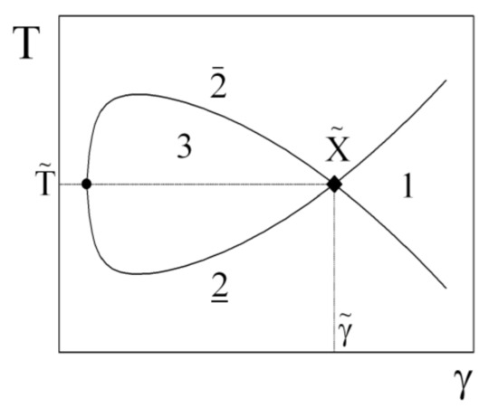 Figure 2. Scheme of a fish phase diagram of a microemulsion with nonionic surfactants: Temperature versus surfactant content. The different coexisting phases are indicated by the numbers. The fish tail point is indicated by X ˜ = ( γ ˜ , T ˜ )