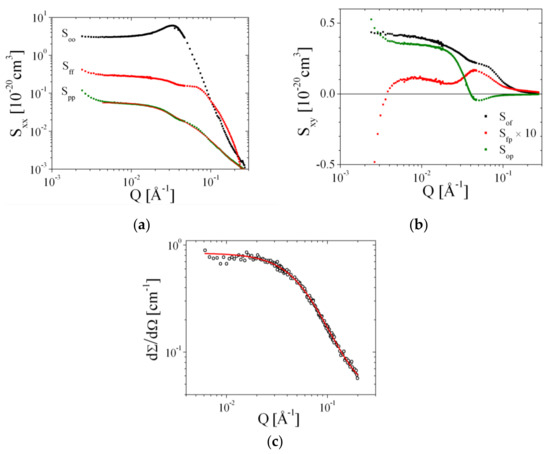 where the indices i and j represent oil (o), film or surfactant (f), or polymer (p) and the water parameters (w) are mentioned explicitly. Even though there are two indices i , j = : k , a unified index k can describe all 6 different contrast conditions. Usually, the experimental conditions of contrasts indexed by are many more than the 6 different principal contrasts, and so the partial scattering functions are overdetermined (see Figure S11 in the Supplementary Materials). The matrix of the different experimental contrasts can be formally inverted by the singular value decomposition method, and so, the partial scattering functions are determined with a high degree of experimental accuracy:
