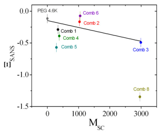 The coefficients that describe the sensitivities of the comb polymer effect on the bending rigidity, the saddle splay modulus, and the mean curvature, namely, Ξ ^ , ϒ, and Ξ SANS , are plotted as a function of the side chain molar mass (Figure 11, Figure 12 and Figure 13). All coefficients were determined analogously to Comb 4 and the analysis is presented in Figures S3–S10 in the Supplementary Materials. As a guide of the eye, we have included linear regression lines for the polymer series, i.e., PEG, Comb 1, Comb 2, and Comb 3. All four polymers have nearly the same backbone fragment size with the different side chain lengths (Table 1). It can be seen that this series of data points already describes a well-defined trend for all three coefficients. Such a trend could be explained by the increasing effect of the side chain confinement along the backbone with increasing side chain length, which, in turn, influences the coefficients. For 2-dimensional brushes, a different scaling with the normalized grafting density is known [18]. However, this previously formulated that power law behavior does not necessarily apply in our case. Instead, it seems that in our representation, the three coefficients scale linearly with the side chain molar mass, MSC, which, in turn, would indicate an M SC 2 scaling for the bare elastic constants. Furthermore, the starting values for PEG are close to the coefficients of bare telechelic polymers [6] when the domain size (d = 103 Å = dTS/2) divided by the fragment end-to-end distance (∼30 Å) is approximately 2 ( Ξ ^ = 1 , ϒ = 0 and Ξ SANS = 0 ), i.e., close to weak confinement of the backbone. The comb polymers 2, 6, and 7 with differing backbone fragment length are nearly indistinguishable, whereas the comb polymers 1, 4, and 5 show a trend that points in the same direction as the growth of side chain length. In the latter case, the confinement is achieved by shortening the backbone fragment length. Why this is more pronounced than in the case of Combs 2, 6, and 7 is not immediately obvious.