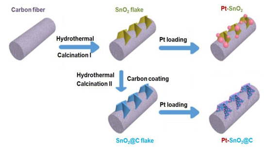 Figure 1 presents the schematic illustration of synthesis procedures of Pt-SnO2/CP and Pt-SnO2@C/CP. First, through a hydrothermal reaction, SnO2 grows on the surface of carbon fibre to form a flake-like SnO2. Next, a carbon layer is coated on the SnO2 to form a core-shell structure. Finally, Pt nanoparticles are deposited on the SnO2/CP and SnO2@C/CP supports using the same impregnation-reduction method. Details of the syntheses are described in the next section.