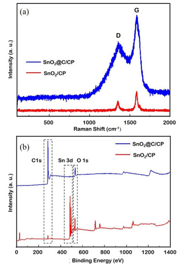 (a) Ramen spectra; and (b) X-ray photoelectron spectroscopy (XPS) spectra of SnO2/CP.