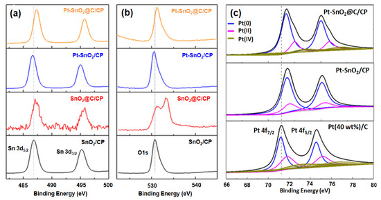 Figure 7a compares the XPS spectra of Sn 3d in different samples. The peaks located at 486.8 and 495.3 eV correspond to the binding energies of a Sn–O bond. Figure 7b shows the spectra of O1s, which correspond to that of Sn 3d in these samples. It is worth noting that there is one more peak at the binding energy of 533.4 eV for the SnO2@C/CP composite. This peak could be attributed to O1s of H2O derived from the aqueous mixture after Pt loading. Without the carbon coating, Pt spheres were directly loaded on the SnO2/CP, and the binding energy of Sn-O shifts towards lower binding energy levels. This was caused by the strong interaction between the Pt and SnO2 [49]. The positive shift of the Pt peak in Figure 7c also confirms this result. After the carbon coating, the binding energy of Sn-O shifts towards higher energy levels. According to the literature, this may be due to the formation of highly oxidized Sn-O bonds [47]. The characteristic peaks of the Pt-SnO2@C/CP have a similar binding energy at 487.3 and 495.8 eV to the SnO2@C/CP. Although the presence of the carbon layer the Pt peak still shifts towards higher binding energy, the interaction is still operative between Pt and SnO2. The synergistic effect between catalyst and metal oxide could result in higher catalytic activity [49]. Moreover, from the Pt peak fitting, there are three types of platinum: zero (0); bivalent (II); and tetravalent (IV). By observing the peak area, the Pt catalyst prepared by the room temperature reduction method has less Pt in the oxidation state, while the Pt (0) content has increased relatively, and thus the utilization rate of Pt has improved.